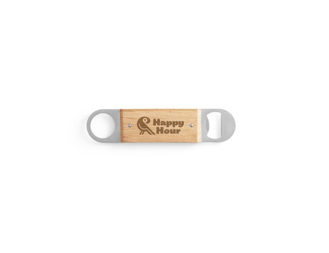 Abridor de garrafas em aço inox com corpo em madeira de faia. Distintivo dos restantes por conter um abridor de um lado e uma argola para facilitar sua arrumação. A cor e o resultado da impressão nos materiais naturais pode variar entre produtos. 40 x 180 x 10 mm