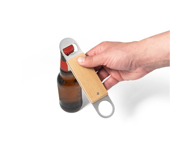 Abridor de garrafas duplo em aço inox com corpo em bambu