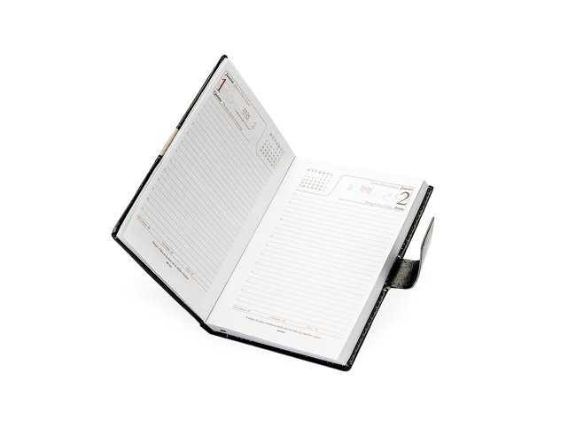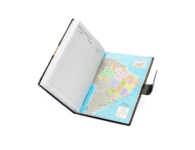 Agenda diária 2026 com capa em couro sintético, marca-páginas em fita de cetim e fecho com suporte para caneta. Contém páginas dedicadas para dados pessoais, calendários de 2025 a 2027, lista de contatos, planejamento e mapas.OBS.: IMAGEM MERAMENTE ILUSTRATIVA, NÃO ACOMPANHA CANETA