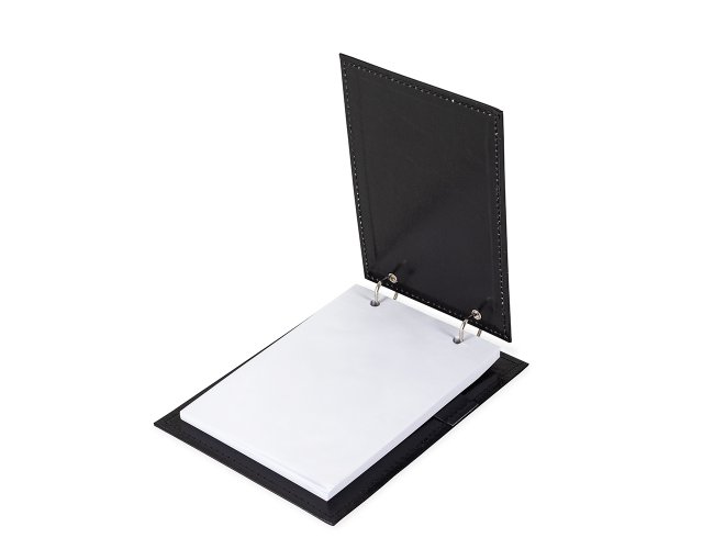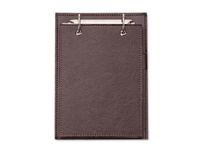 Bloco de anotações de mesa com trilho de ferro, capa em couro sintético. Possui suporte na lateral interna para colocar caneta (não acompanha) e aproximadamente 96 folhas recicladas com área destacável.