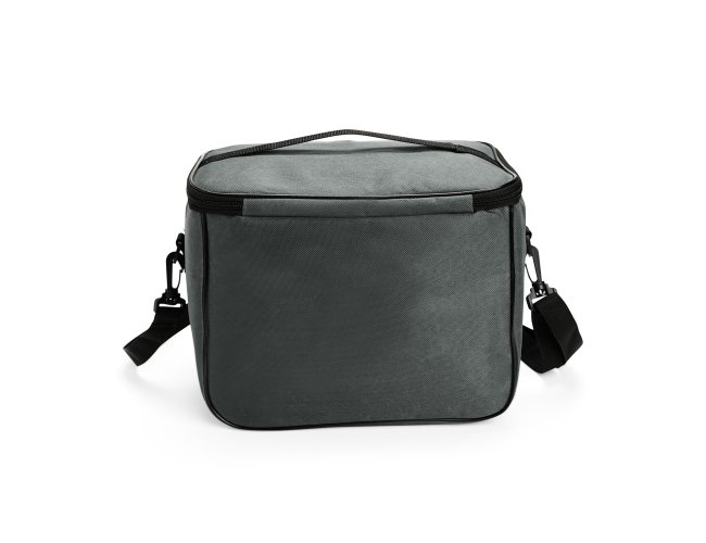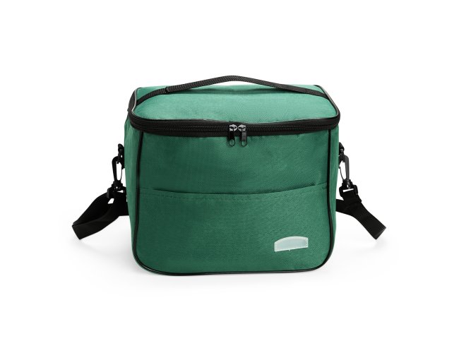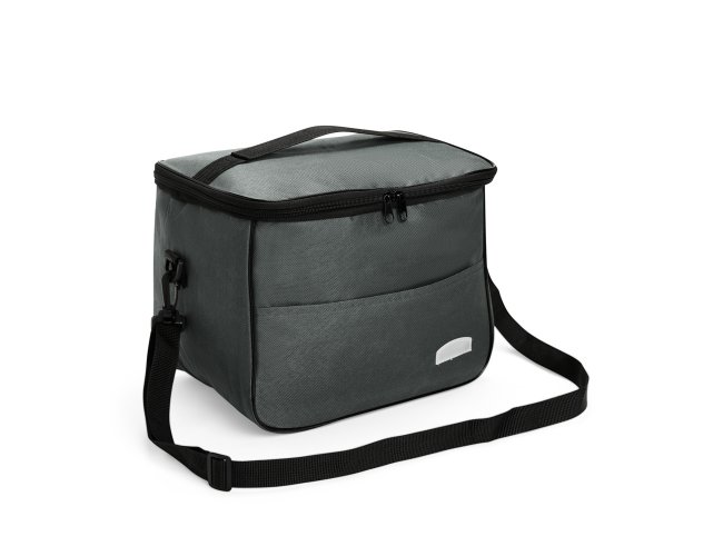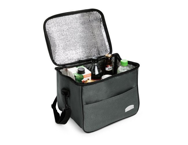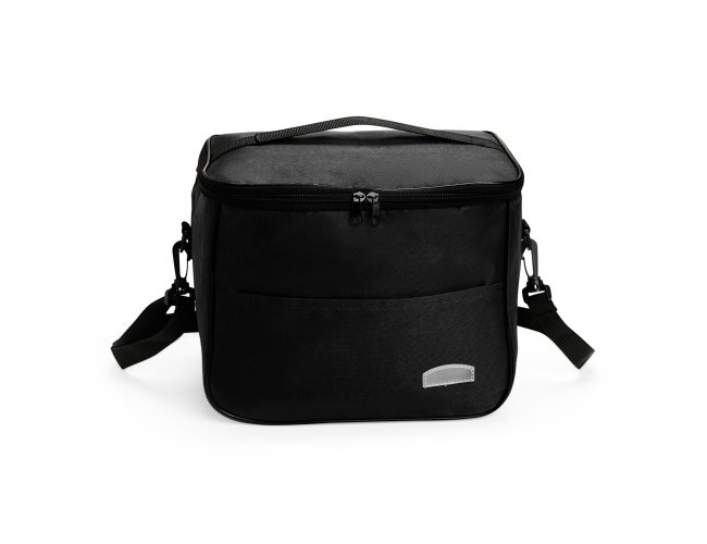 Bolsa térmica feita em Oxford resistente à água, com fechamento em zíper e capacidade de até 13 litros. Possui revestimento térmico em folha de alumínio, bolso frontal externo e duas alças: uma fixa localizada na tampa e outra transversal removível.