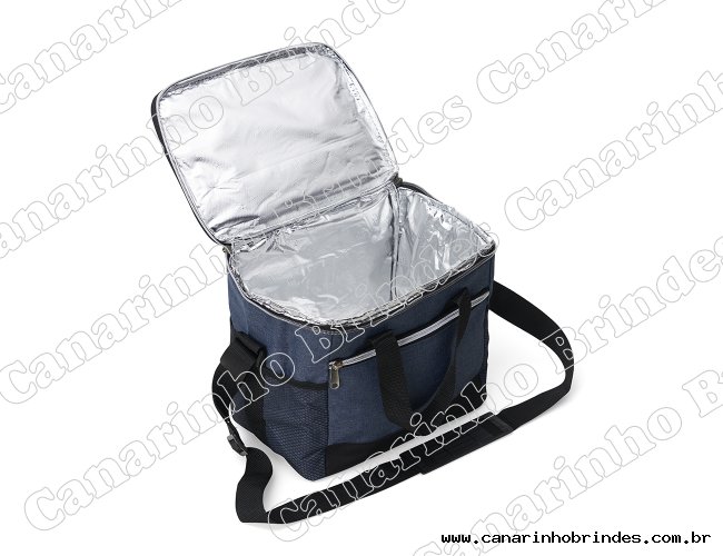 Bolsa térmica 21 litros. Contém bolso frontal com zíper, bolsos laterais telados, alça de mão em nylon e alça transversal regulável (não removível) com apoio para ombro.