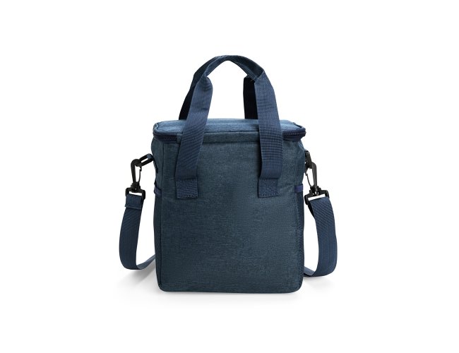 Bolsa térmica em Oxford resistente à água, com capacidade de até 7 litros e fechamento em zíper. Possui revestimento térmico em folha de alumínio na tampa e em PEVA no restante do interior, contribuindo para conservar a temperatura de alimentos e bebidas por mais tempo. Apresenta bolso frontal externo com zíper e dois bolsos laterais em tela de nylon com elástico. Dispõe ainda de duas alças laterais fixas e uma alça transversal removível.