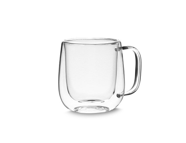 Caneca de vidro borossilicato com parede dupla, com capacidade de até 250ml.