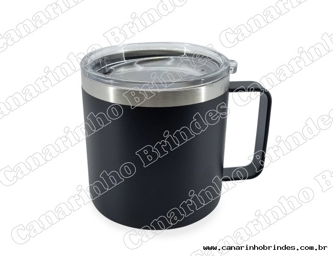 Caneca térmica de inox 450ml com parede dupla e tampa com acesso ao bocal.