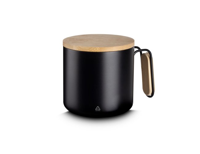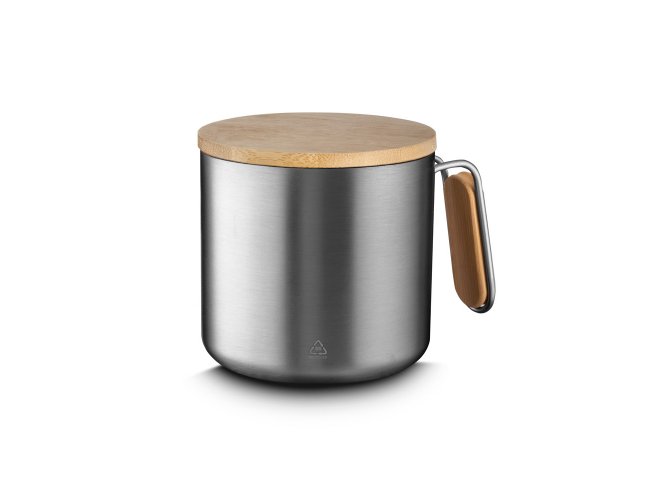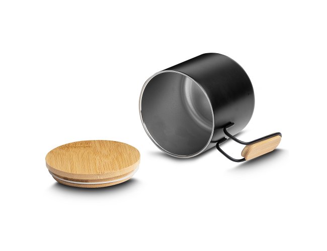 tampa de bambu e anel em silicone para vedação, alça lateral com detalhe em bambu.