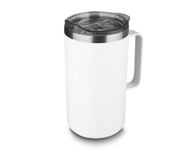 Caneca térmica em aço inox com parede dupla isolada à vácuo, tampa plástica e anel em silicone para vedação, alça lateral. Capacidade 750ml, parede externa com pintura a pó.