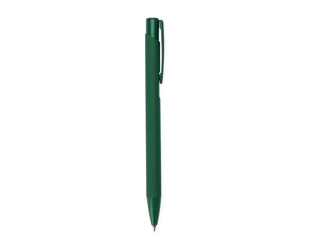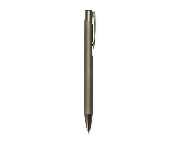 Caneta metálica com ponta e clip em plástico. Possui acionamento por clique e carga esferográfica azul de 1.0mm.