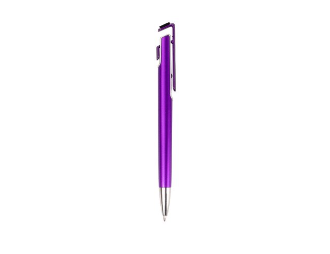 Caneta plástica com ponta metálica, acionamento por clique e abertura que funciona como suporte de celular.