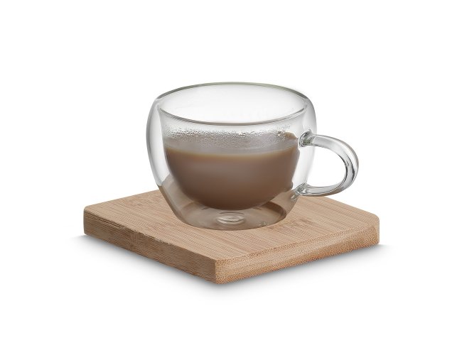 Conjunto com 2 xícaras de vidro borossilicato com parede dupla e capacidade de até 60ml.