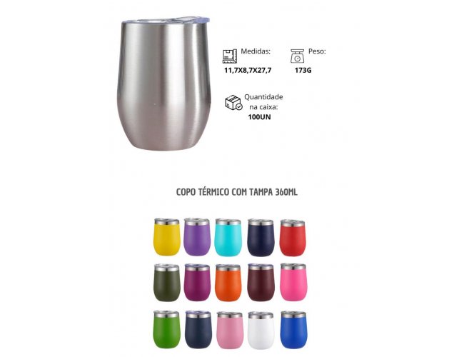 Copo térmico de capacidade de 360ml, feito em inox, com parede dupla e tampa plástica (livre de BPA) com bocal para um consumo mais rápido e prático.