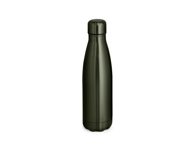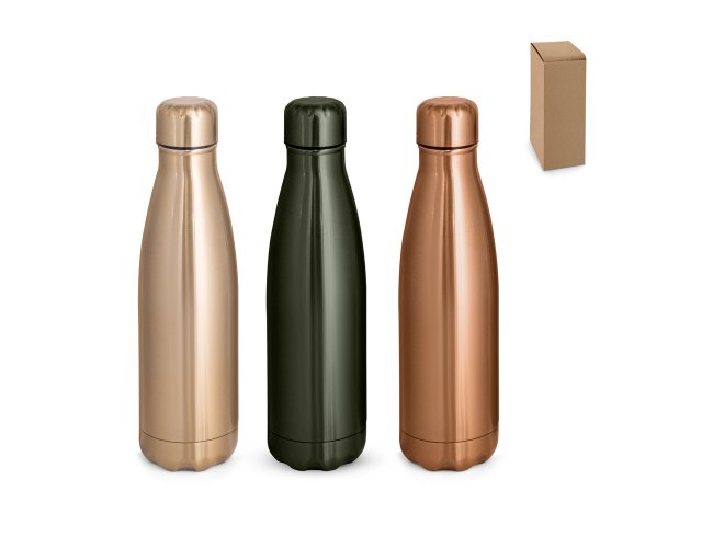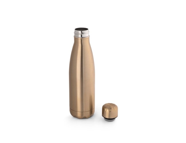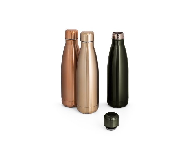 Garrafa com acabamento metalizado e tampa em aço inox. Capacidade até 510 mL.