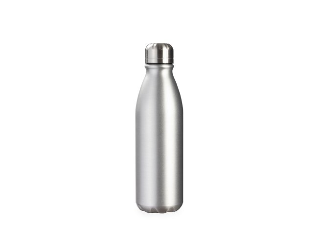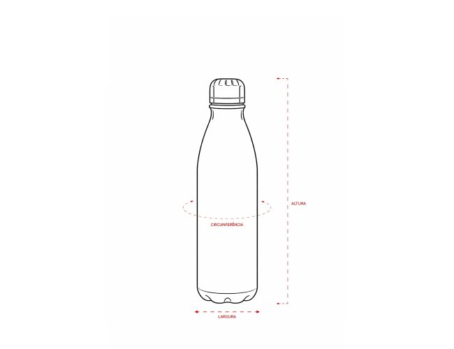 Garrafa em alumínio com acabamento em verniz fosco, revestimento plástico no bocal e capacidade para até 750ml. Possui tampa rosqueável em alumínio com interior em plástico.
