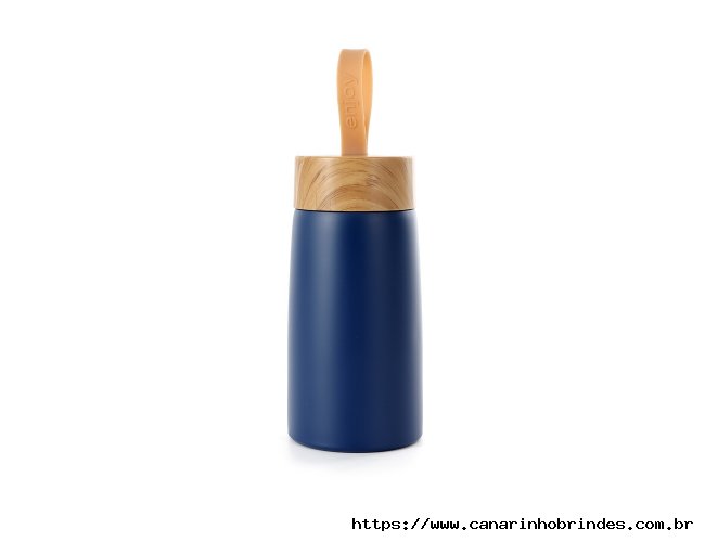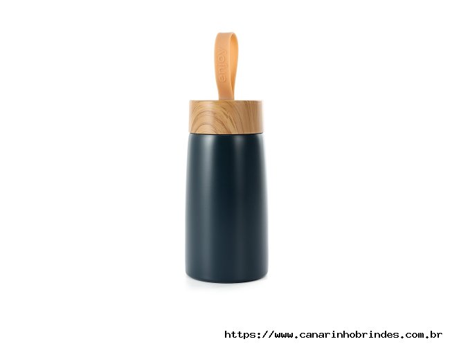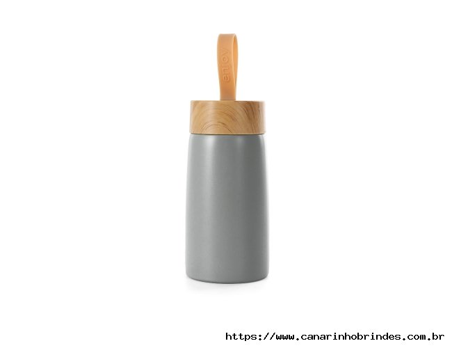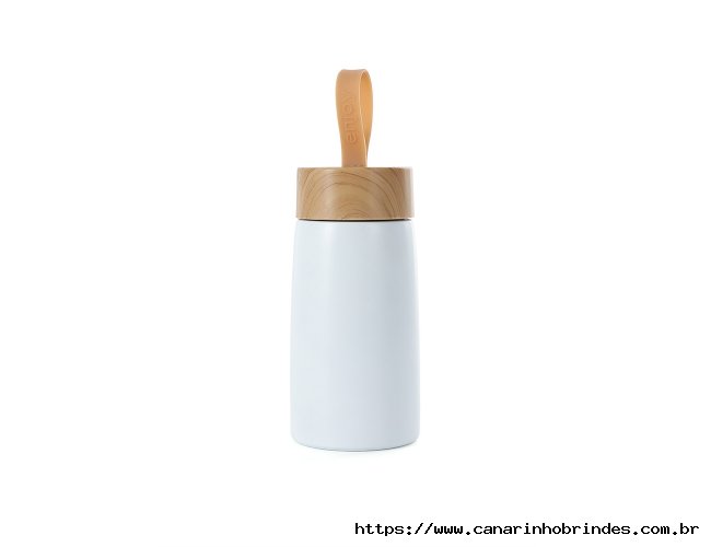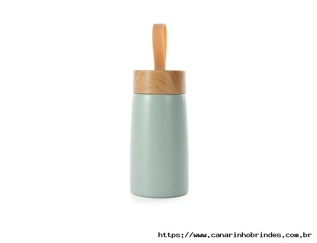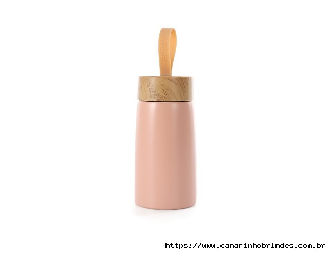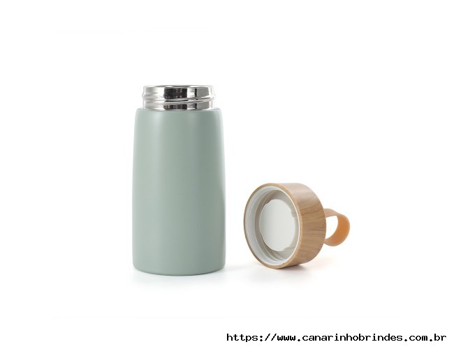 Garrafa inox 304 com parede dupla, capacidade de 250ml. Contém tampa plástica com design de bambu e alça de silicone para transporte.