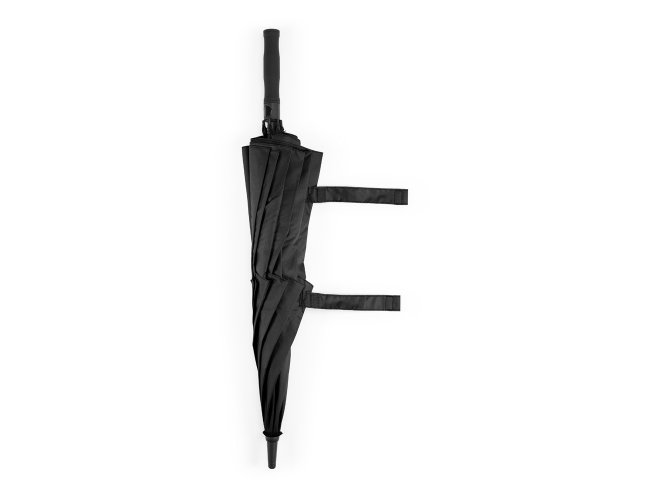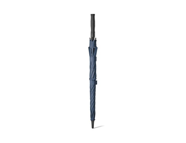Guarda-chuva em poliéster 100% reciclado 190T, com varetas em fibra de vidro e pega em ABS reciclado.