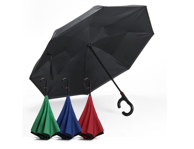 Guarda-chuva invertido com forro interno. Tecido ponge chinês e seda poliéster, possui um mecanismo inovador permitindo que o usuário não se molhe ao entrar e sair de ambientes devido sua abertura invertida, quando feito o movimento para fechar as varetas inverterão para cima criando um formato circular impedindo a chuva de atingir o usuário, podendo “segurar” a chuva enquanto entra/sai de um ambiente, ao virar o guarda-chuva a água irá escorrer. Forro interno para preservação das 8 varetas, evitando contato com a água e assim prolongando seu tempo de uso sem enferrujar. Ao impulsionar o fechamento invertido fica mais rápido e prático o modo de secar e ser guardado, pode ser apoiado no chão que permanecerá em pé para escorrer a água. Pegador plástico fosco em formato C, botão acionador vermelho e fita com velcro para lacre.