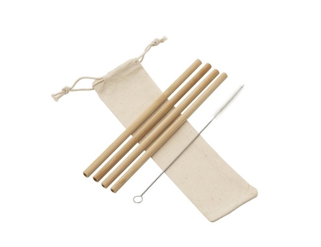 Contém 4 canudos de bambu e escova de limpeza com ponteira plástica. Acompanha estojo de algodão reciclado