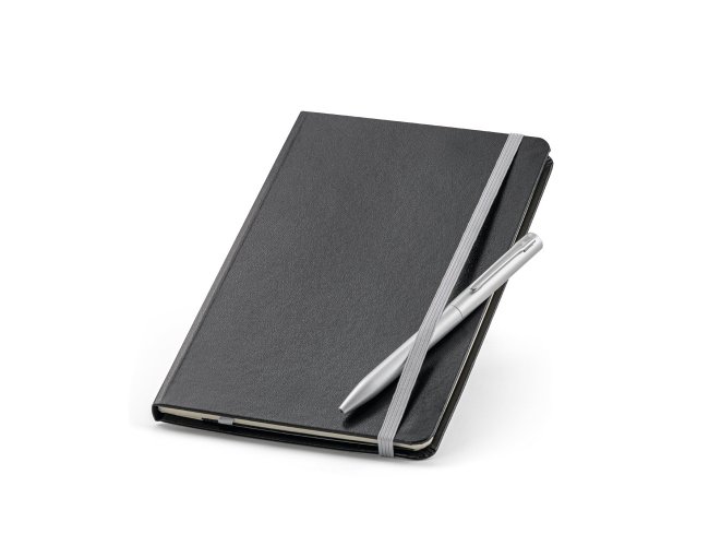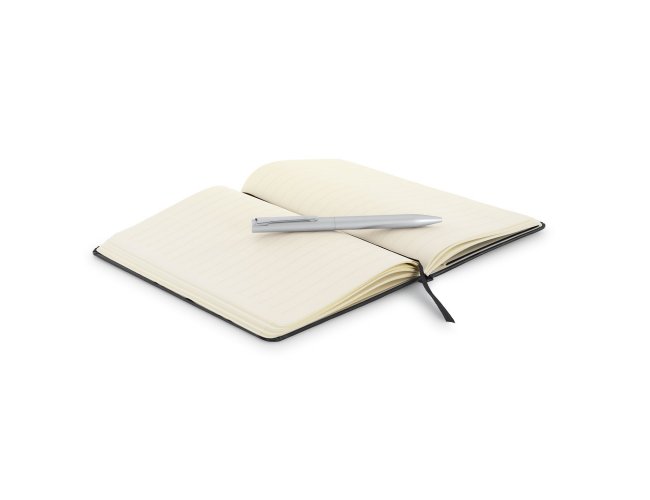 Conjunto esferográfica e caderno A5. O caderno A5 de capa dura tem 160 páginas pautadas cor marfim, fita separadora, bolso interior e elástico para fecho do bloco. A esferográfica em alumínio e clipe de ferro, tem mecanismo twist e escrita em azul. Conjunto fornecido em caixa de oferta. Esferográfica: ø10 x 138 mm | Caderno: 137 x 210 mm | Caixa: 190 x 240 x 30 mm
