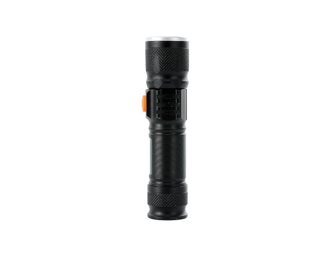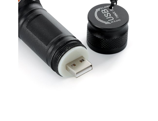 Lanterna led recarregável com zoom de regulagem e três estágios de iluminação, material metálico com USB acoplado para carregamento. Acompanha cordão de nylon.