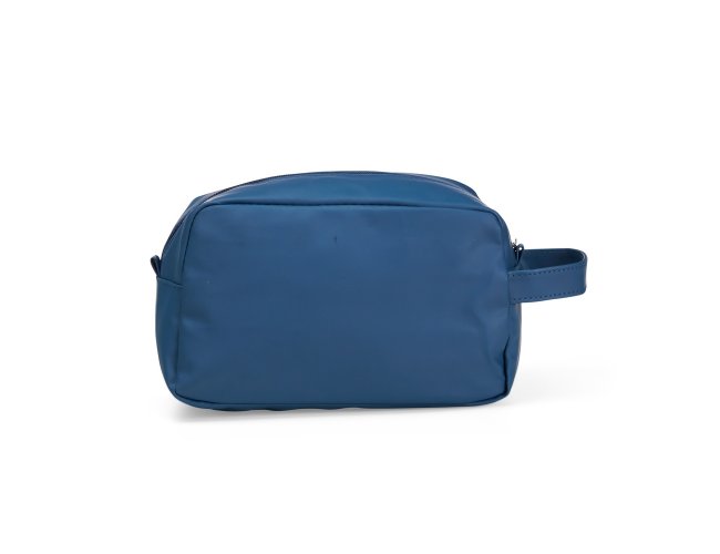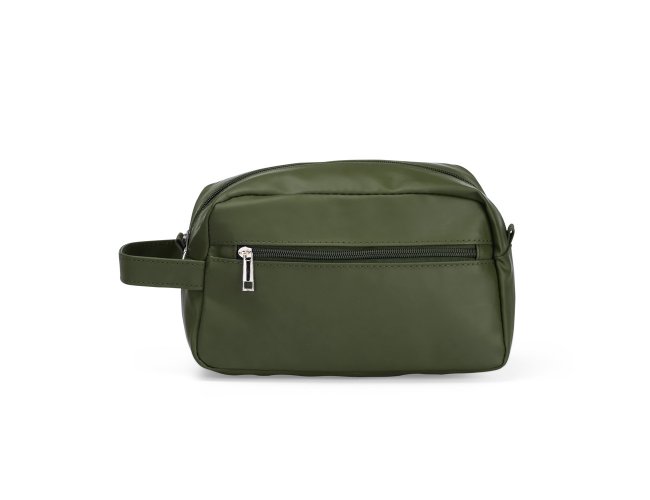 Nécessaire confeccionado em couro sintético impermeável. Possui compartimento principal com fechamento em zíper, além de um bolso frontal externo, alça de mão e duas alças menores para fixação de chaveiro ou gancho.