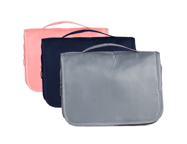 Necessaire organizadora “travel”. Tecido Sarja, abertura frontal por velcro e alça superior, parte interna com gancho plástico; bolso interno superior de pvc e bolso de tela superior, ambos de zíper; dois bolsos inferiores de zíper, sendo o primeiro com detalhe superior em tela e 3 divisões internas com 3 elásticos para fixação, segundo bolso na parte frontal interna; parte traseira possui um bolso externo. Perfeita para lhe acompanhar em viagens e até mesmo transportar seus itens pessoais do dia a dia com organização e praticidade.