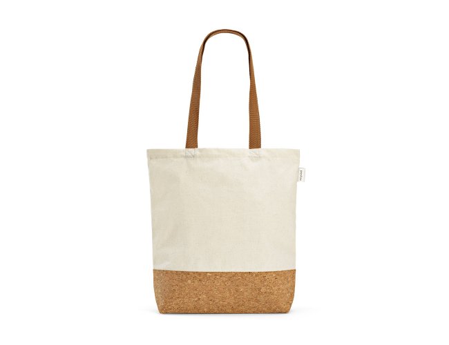 Sacola em 70% algodão reciclado e 30% poliéster reciclado (180 g/m²) com fundo em cortiça