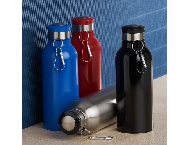Possui tampa rosqueável e acompanha chaveiro mosquetão.