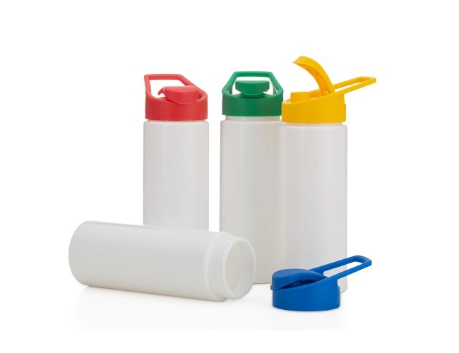 Descrição: Squeeze de polietileno 550ml com tampa plástica rosqueável, contém alça e tampa protetora para o bocal.