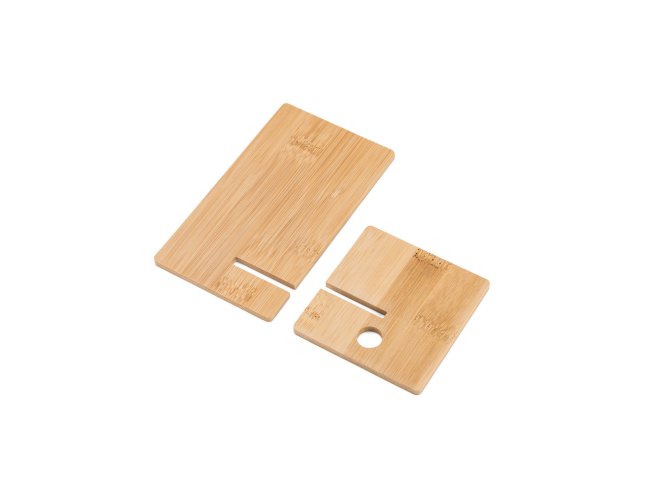Suporte para celular em bambu, desmontável em duas partes. Contém um orifício que lhe permite carregar o seu celular enquanto utiliza o suporte. Fornecido em caixa presente de papel kraft reciclado. A cor e o resultado da impressão nos materiais naturais pode variar entre produtos. Dimensões montado: 80 x 130 x 80 mm | Caixa: 83 x 12 x 140 mm