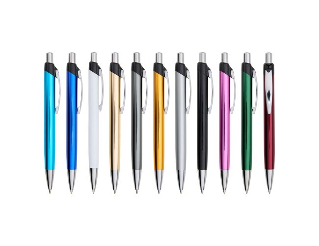 Caneta semi-metal colorida, com empunhadura detalhada. Personalizada, brinde promocional ótima opção de brinde para divulgar sua marca em feiras, eventos e convenções.